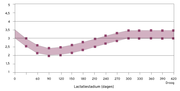 Bandbreedte voor het “veilig” verloop van de conditie gedurende de lactatie en de maximale vermindering van de BCS. Om gezondheidsschade te voorkomen mag een koe nooit meer dan 0,5 punt BCS verliezen in de eerste 30 dagen en nooit meer dan 1 punt binnen 90 dagen.
