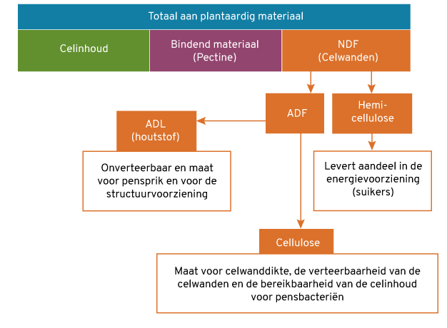 De dikte en de (on)verteerbaarheid van de celwanden leveren een bijdrage aan de structuur. Een ouder gewas heeft dikkere, minder goed verteerbare celwanden en minder celinhoud (suiker, zetmeel, eiwit) waardoor de voederwaarde minder is. Het totaal aan celwanden wordt weergegeven als de NDF. Onverteerbare, verhoute deel van de celwanden worden weergeven als de ADL, een maat voor de structuur in verband met het herkauwen. De gehalten aan NDF en ADL stijgen naarmate het gewas ouder wordt. Een lage NDF met bijvoorbeeld 16 gram verhout (ADL) duidt op een jong gewas. De NDF in een basisrantsoen moet minimaal 300 gram /kg DS bedragen. Voor de ADL wordt wel een ondergrens van 20 gr/kg DS aangehouden. Op de uitslag van de ruwvoeranalyse staat meestal ook de structuurwaarde. Er wordt bij het bepalen van de structuurwaarde bij de kuilanalyse echter geen rekening gehouden met de lengte van het ruwvoer. Daarom geeft de structuurwaarde slechts een globale indicatie van de hoeveelheid structuur in het ruwvoer. Fijn gehakseld gras kan volgens de kuilanalyse een hoge structuurwaarde hebben, maar in werkelijkheid niet hebben. De echte structuurwaarde is dus niet goed in cijfers uit te drukken. Maar hoe dan wel?