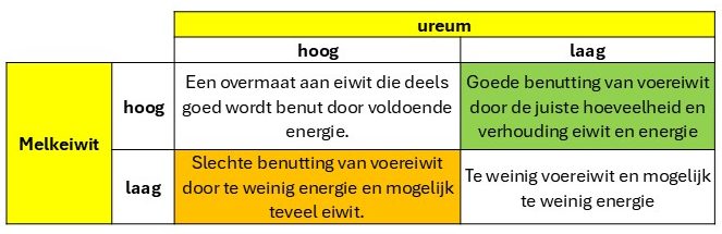 Relatieschema energie- en eiwitvoorziening en ureum- en eiwitgehalte in de melk. De combinatie van enerzijds het eiwitgehalte in de melk en anderzijds de hoeveelheid ureum in de melk geeft een indicatie van de eiwitbenutting. Als voereiwit goed wordt benut gaat weinig verloren als ureum en wordt het goed benut voor melkeiwit, en andersom.