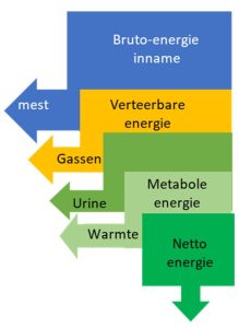 In de figuur schematisch de verdeling van de opgenomen energie bij een koe. De VEM-waarde van een rantsoen die berekend wordt op basis van de verschillende componenten in het voer, staat voor de netto bruikbare energie voor de melkproductie. Dat is slechts een beperkt gedeelte van de totale inname omdat de koe het nodige verbruikt voor onderhoud, beweging, stofwisseling, stress, afweer, dracht en herstel. De uiteindelijke hoeveelheid netto energie voor de melkproductie is dus van veel factoren afhankelijk. Die bepalen voor een belangrijk deel de benutting van de energie voor de melkproductie en dus de voerefficiëntie. Hoe minder energie een koe nodig heeft voor haar eigen functioneren, hoe meer ze kan gebruiken voor de productie. De verhoudingen in de figuur zijn slechts ter illustratie en in werkelijkheid kan het sterk afwijken.