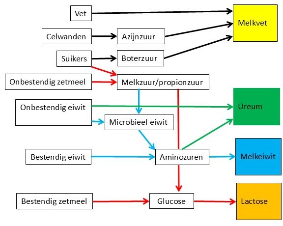 Onbestendig zetmeel en suikers, worden in de pens eerst omgezet in melkzuur en vervolgens in propionzuur waaruit lactose wordt gemaakt. Bestendig zetmeel passeert de pens en wordt in de darmen omgezet in glucose dat de lactoseproductie en de melkproductie verhoogt. Lactose trekt vocht aan in het uierweefsel waardoor de hoeveelheid melk stijgt. Uit afbreekbare celwanden (structuur) wordt azijnzuur gemaakt dat verantwoordelijk is voor het vetgehalte in de melk. Het bestendig eiwit en het microbieel eiwit worden gebruikt voor de productie van melkeiwit. In de figuur is schematisch weergegeven hoe de nutriënten de melksamenstelling beïnvloeden.