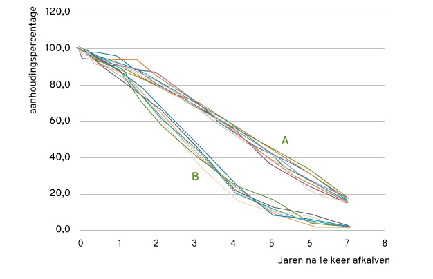 Om de verschillen nog duidelijker in beeld te brengen vergelijken we in anoniem de 10 stieren met de hoogste waardering van aanhoudingscijfers met de 10 stieren met de laagste waardering. Bij de top 10 is gemiddeld ruim 40% van de dochters 5 jaar na de eerste keer kalven nog in productie. Bij de 10 stieren met de laagste waardering is dat nog maar ruim 10%. Wat daarbij opvalt is dat de sterke afname al na een jaar inzet. Na 4 jaar wordt duidelijk dat er nog maar een klein percentage dochters is dat relatief oud wordt. Het aantal dochters dat na een bepaald aantal jaren nog in productie is neemt dus meer of minder snel af. De daling van de overlevingskans is bij de ene stier veel sterker dan bij de andere en de kans op echte levensduurkoeien dus ook.