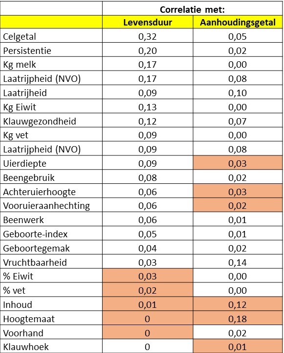 Tabel. Correlaties van de fokwaarden van specifieke kenmerken met de fokwaarde voor levensduur, in volgorde van de sterkte van de correlatie (linker kolom) en met aanhoudingscijfers in dezelfde kenmerken-volgorde (rechter kolom). De rode cellen zijn negatieve correlaties.