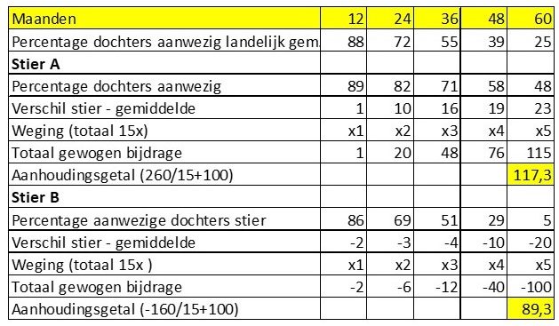 Het aanhoudingsgetal wordt berekend uit het verschil tussen de aanhoudingspercentages van de dochters van een stier op 12, 24, 36, 48 en 60 maanden na de eerste keer kalven en het landelijk gemiddelde op dat moment. Omdat met het ouder worden de kans op afvoer steeds verder toeneemt, telt elk extra jaar dat een dochter nog in leven is, bij wijze van ‘beloning’ zwaarder mee in het aanhoudingsgetal. Een lager percentage dan gemiddeld wordt ‘bestraft’. De verschillen op de achtereenvolgende meetmomenten worden dus ‘gewogen’, beginnend met 1x het verschil bij 12 maanden tot 5x het verschil bij 60 maanden. Voor voldoende betrouwbaarheid moet een stier minimaal 100 dochters hebben. In de tabel hebben we een voorbeeld van 2 stieren gegeven. Stier A met een bovengemiddeld aanhoudingsgetal en stier B met een ondergemiddeld aanhoudingsgetal. Heeft een stier op een bepaald meetmoment niet voldoende dochters dan telt dat meetmoment niet mee in de berekening.