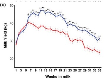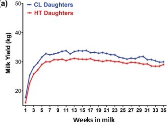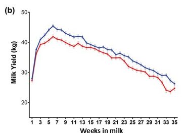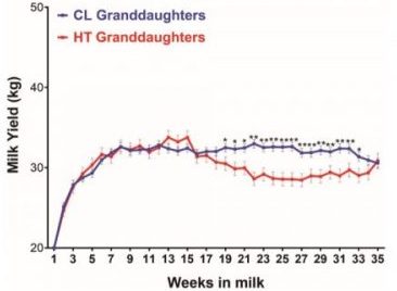 In de figuur hierna het productieverloop van kleindochters na koeling van de grootmoeder tijdens de droogstand (blauw) en de dochters zonder koeling van de grootmoeders tijdens de droogstand (rood) in de eerste lactatie gemeten over een lactatieperiode van 35 weken. In de 2e en 3e lactatie van de kleindochters was er nog wel een verschil maar het verschil was niet meer significant.