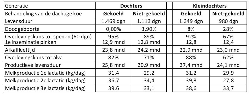 De doodgeboorte bij de dochters was bij niet-koelen gemiddeld wat hoger maar niet significant. De kans op afvoer in de periode voor het spenen en in de periode tot de 1e inseminatie verschilde in deze proef niet significant. Wel was de kans op afvoer van de dochters in de periode tot de eerste keer afkalven iets hoger bij niet-koelen, maar de gemiddelde leeftijd van de afgevoerde kalveren en pinken vóór de eerste keer kalven was vergelijkbaar bij koelen en niet-koelen. De afkalfleeftijd was ook vergelijkbaar. De totale levensduur van de dochters uit de gekoelde koeien was 365 dagen langer dan van de dochters uit de niet-gekoelde koeien. De kans op afvoer in de eerste 5 jaar van de dochters was duidelijk hoger bij niet-koelen. De productieve levensduur, gerekend vanaf het moment dat ze in lactatie kwamen, was ca. 5 maanden langer bij actief koelen. Er was geen significant verschil in reproductieresultaten (vruchtbaarheidsresultaten). De gemiddelde leeftijden bij de 2e en 3e keer afkalven waren vergelijkbaar.