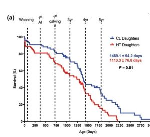 Grafieken hierna. Verloop van de overlevingskans in de loop van 5 jaar vanaf geboorte van dochters (a) en kleindochters (b) van koeien die leden onder hittestress gedurende de droogstand (rood) of actief gekoeld werden tijdens de droogstand (blauw). De overlevingskans is het omgekeerde van de kans op uitval. De eerste grafiek van de dochters laat zien dat er een flink verschil in overlevingskans bestaat en daarmee dus ook in de uiteindelijke levensduur. In de tweede grafiek de overlevingskans en de levensduur van kleindochters waarbij te zien is dat de gemiddelde levensduur korter is dan van de dochters, maar dat het uiteindelijke verschil tussen gekoeld en niet-gekoeld niet meer significant is.