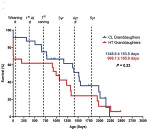 De doodgeboorte bij de kleindochters uit de niet-gekoelde koeien lag hoger maar het verschil was niet significant. De kans op afvoer tot de 1e inseminatie was ook hoger bij de kleindochters van de niet-gekoelde koeien, maar uiteindelijk was er nauwelijks verschil in het aantal dieren dat werd afgevoerd vóór de 1e keer kalven. Er percentage van de kleindochters dat op 3-jarige leeftijd was afgevoerd was vergelijkbaar met dat op 5-jarige leeftijd en verschilde niet tussen koelen en niet-koelen. Het percentage afvoer op 4 jaar was bij koelen lager dan bij de niet-koelen. Uiteindelijk was het verschil in de totale levensduur tussen de groepen gemiddeld 3,3 maanden in het voordeel van de kleindochters van de gekoelde koeien, maar het was niet significant. Hoewel er bij de kleindochters een verschil in productieve levensduur van ca. 370 dagen werd gemeten was dit verschil in deze proef niet significant door de relatief grote spreiding. Weliswaar was de gemiddelde levensduur van de kleindochters gemiddeld ca. 15 maanden korter dan die van de dochters, zonder aanwijsbare reden, maar het verschil tussen de kleindochters van gekoelde en niet-gekoelde ouders was niet meer significant.