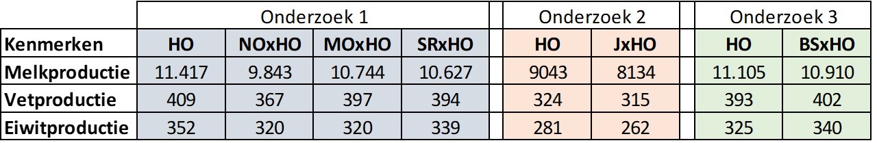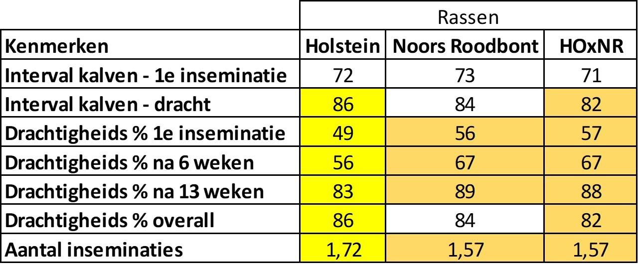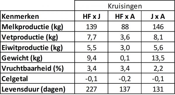 - Benutting van de heterosiseffecten als gevolg van de samenvoeging van verschillende genetische lijnen die een verbeterde prestatie bij de koeien laten zien. Er bestaan grote verschillen in heterosiseffecten bij de verschillende kenmerken. Het kan variëren van 0 tot 10% voor productie tot 25% voor vruchtbaarheid.