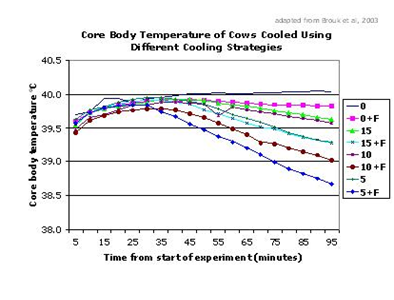 Tweede figuur: Naarmate het sproei-interval korter is wordt een minder hoge lichaamstemperatuur bereikt en daalt die na ongeveer 25 minuten ook sterker. Alleen sproeien heeft beduidend minder effect dan in combinatie met ventileren.