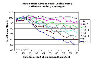 Eerste figuur: De ademhalingsfrequentie neemt meer af naarmate het sproei-interval korter is en er tegelijkertijd geventileerd wordt. Het effect treedt bij korte intervallen in combinatie met ventileren al op na 15 minuten en bij langere intervallen na ongeveer een half uur. Alleen ventileren heeft weinig effect.