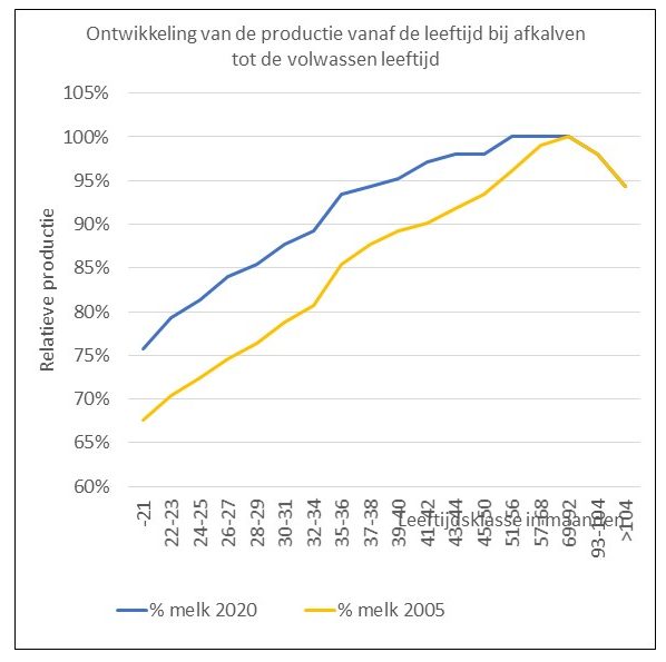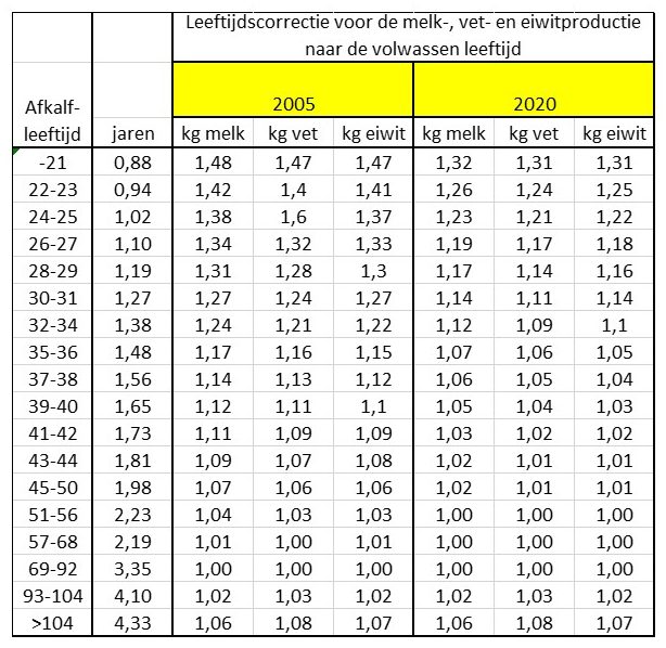 In de tabel is van vóór (kolom 2005) en van ná september 2020 (kolom 2020) aangegeven hoe de lactatieproductie gecorrigeerd moet worden om de gestandaardiseerde productie op volwassen leeftijd te kunnen inschatten. De productie van een koe die 40 maanden oud is als ze kalft moet met 1,05 vermenigvuldigd worden. Daarvoor was het met 1,12 en daarmee valt de berekende lactatiewaarde na de aanpassing lager uit terwijl de productie op het moment dat de LW wordt berekend nog steeds hetzelfde blijft. In de tabel daarna is de ontwikkeling van de productie vóór de aanpassing in 2020 weergegeven (lijn 2005) en die daarna (lijn 2020).  Duidelijk is te zien dat de lijn 2020 aanzienlijk minder stijl verloopt omdat koeien op jonge leeftijd in verhouding tot de volwassen productie meer melk zijn gaan geven.