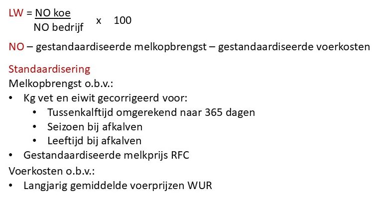 De NO wordt berekend op basis van de lactatieproductie, gecorrigeerd de tussenkalftijd, voor de leeftijd bij kalven en het seizoen van kalven en gestandaardiseerd voor voerprijzen en melkprijzen.