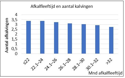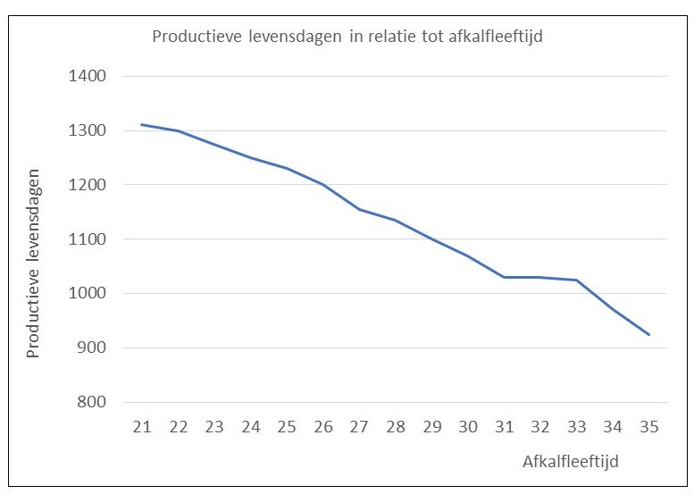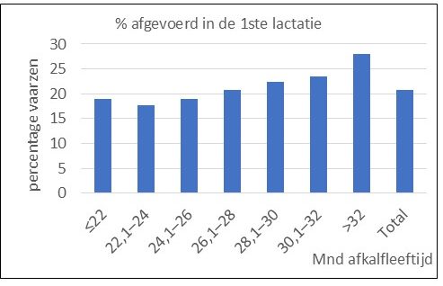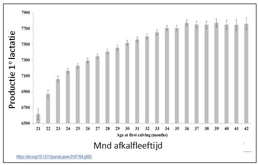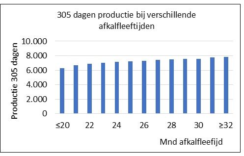 De optimale afkalfleeftijd ligt ergens tussen 23 en 24 maanden laten de diverse onderzoeken zien. Maar ze laten nog meer zien. Namelijk dat een te hoge afkalfleeftijd tot vervroegde afvoer kan leiden. Weliswaar lijkt de productie in de eerste lactatie boven gemiddeld maar kennelijk voldoen de vaarzen niet. Omdat de vaarzen mogelijk pas worden afgevoerd aan het einde van de lactatie kan de eerste afkalving al voor problemen hebben gezorgd en de conditie lastig te controleren zijn geweest.