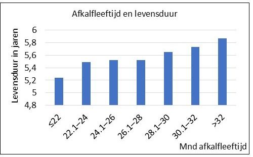 In onderstaande figuur 1 is afkalfleeftijd afgezet tegen de levensduur in jaren. De levensduur neemt toe bij een hogere afkalfleeftijd, maar dat is mede te wijten aan het feit dat de langere opfokperiode in de levensduur is opgenomen. Kijk je naar het aantal afkalvingen in figuur 2, de productieve levensduur, dan zien we het omgekeerde: de meeste afkalvingen bij een afkalfleeftijd van 22,1 tot 24 maanden. Bij de hoogste score voor de levensduur in jaren ligt de gemiddelde afvoerleeftijd bij afvoer onder die in Nederland.