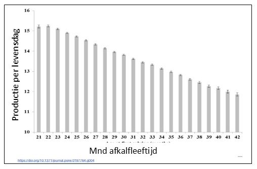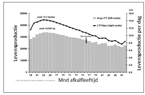 In figuur 11 zien we de levensproductie per levensdag die volgens dit onderzoek het hoogst zou zijn bij een afkalfleeftijd van 22 maanden om daarna sterk te dalen. Dat ligt voor de hand aangezien de productie met de leeftijd stijgt en de dagen opfok meetellen in die berekening. Hoe hoger de afkalfleeftijd hoe lager de productie per levensdag tenzij dat wordt goedgemaakt door een hogere lactatieproductie zoals in figuur 7 is weergegeven. De opfok kan worden gezien als een apart onderdeel omdat er geen sprake is van melkproductie. Bij de productie per levensdag neemt bij een toenemende levensduur de productie per levensdag toe omdat het aandeel van de afkalfleeftijd steeds minder wordt en de productie met de leeftijd stijgt. Dat zorgt voor minder duidelijkheid over het netto effect van de opfok op de levensduur en levensproductie. De levensproductie kan beter uitgedrukt worden per productieve levensdag.