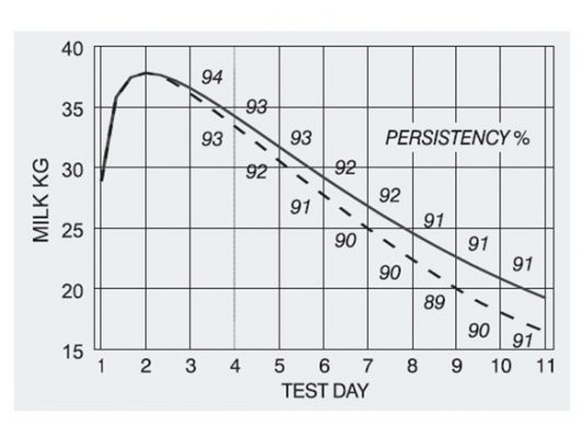 Vaak wordt de verhouding van 0-60 dagenproductie op de 0-305 dagenproductie gebruikt om de persistentie te bepalen. Stel dat de productie in de eerste 60 dagen 1.950 kg bedraagt en de 0-305 dagen productie 8.287 kg dan is het aandeel van de piekperiode 0,24 (24%). Als de 0-60 dagenproductie bij eenzelfde 0-305 dagenproductie 2.526 kg is, dan is dat 0,3 (30%) en bij een 0-60 dagenproductie van 2.718 kg is het 0,33 (33%). Bij een persistente, vlakke curve zou het aandeel minder dan 25% moeten zijn. Het zegt niets over de absolute productie en deze berekening kan bij elk productieniveau gebruikt worden.
