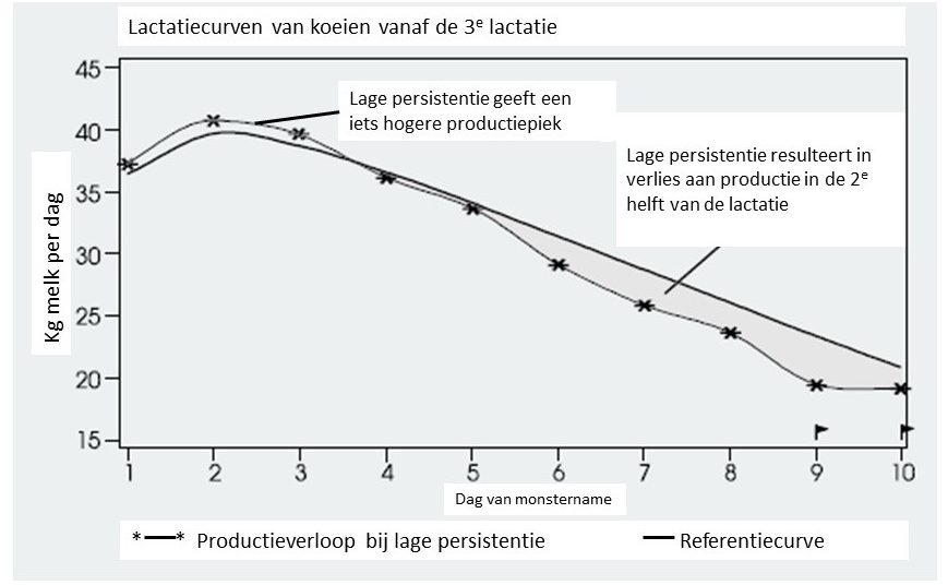 Bij de figuur. Een lage persistentie geeft een hoge productiepiek, een scherpere daling daarna en een minder vlakke lactatiecurve. Met name bij hoog productieve koeien is een hoge persistentie met lage productiepiek belangrijk. Door de vlakker lactatiecurve stijgt de productie terwijl tegelijkertijd door de lagere piek de kans op transitieproblemen afneemt. (Bron figuur: Molenaar A.J.)