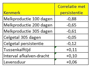 Resultaten van een onderzoek (Strapakova, E et al., 2016) naar de correlaties tussen de fokwaarden voor persistentie en de melkproductie, celgetal, tussenkalftijd, dagen open en levensduur. De negatieve correlatie met de melkproductie betekent dat de hoge productie vooral wordt bereikt door een zeer hoge piekproductie. Een hogere persistentie geeft een lager celgetal en een langere tkt. Dit laatste omdat koeien dan bewust later worden geïnsemineerd. De correlatie met de fokwaarde voor levensduur is zwak omdat daar ook allerlei andere factoren een rol spelen die bepalen of een koe wordt afgevoerd of aangehouden.