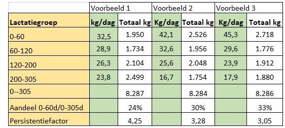 Berekening van de persistentie bij drie koeien die verschillen in persistentie bij een vergelijkbare 305-dagen productie. Het procentuele aandeel staat voor de 0-60 dagen productie gedeeld op de productie van 0-305 dagen. Bij een betere persistentie (voorbeeld 1) is het aandeel van de 0-60 dagen productie op de totale productie kleiner dan bij een lagere persistentie (voorbeeld 3). Een alternatieve berekening is juist omgekeerd, nl. de 0-305 dagen productie delen door de 0-60 dagen productie. Het persistentiegetal is bij een zeer goede persistentie hoger dan 4 en bij een lage persistentie lager dan 3.