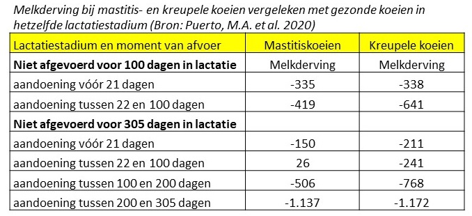 In de tabel hiernaast is de verminderde melkproductie weergegeven van vaarzen die in verschillende lactatie-stadia mastitis krijgen of kreupel worden.