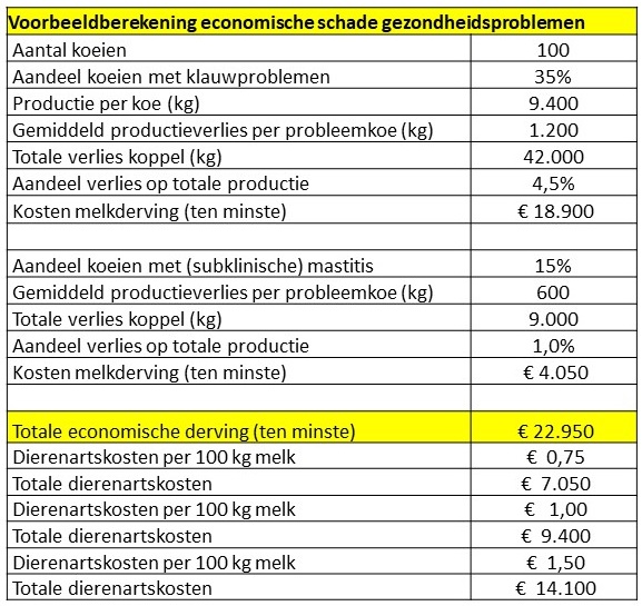 Elk probleem leidt tot andere gezondheidsproblemen of tot vruchtbaarheidsproblemen. Daarmee lopen de kans op vervroegde af voer en de kosten nog eens extra op. De uiteindelijke kosten voor een individuele koe kunnen daarmee oplopen tot ver boven de €500 euro. In nevenstaande tabel is voor een voorbeeldsituatie uit de praktijk een berekening gemaakt van de economische schade, mede in relatie tot de dierenartskosten. Duidelijk is dat extra inzet van de dierenarts zonder meer lonend is. Daarbij komt ook nog eens dat de voerefficiëntie flink verbeterd wordt bij een betere gezondheid.