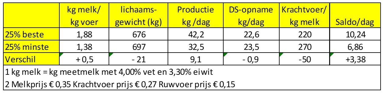 Resultaten van voeropnameproeven van CRV (2017/2021). Aangegeven zijn de 25% best presterende koeien qua voerefficiëntie en de 25% minst presterende. De 25% best presterende koeien produceren 0,5 kg melk per kg DS meer, ze wegen 21 kg minder. Het resultaat is het gevolg van de combinatie van een lager gewicht, een lagere voeropname van zowel krachtvoer als ruwvoer en een hogere productie. Het zijn koeien op een praktijkbedrijf met een hoge productie en een rantsoen dat daarop is aangepast. Het is de vraag of het representatief is voor het gemiddelde Nederlandse bedrijf.