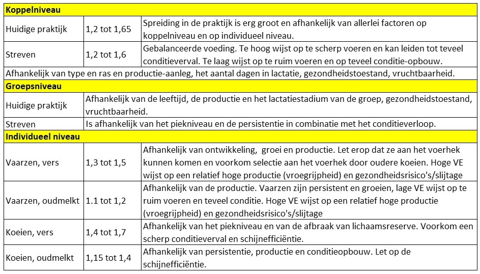 Om te kunnen beoordelen of de VE goed is, kijk je naar de periode waarin hij wordt gemeten: in de gehele lactatie, in de piekperiode (hoge VE), het midden van de lactatie (gem. VE) of in de late lactatie (lage VE). Maar pas op, hier kun je een zogenaamde schijnefficiëntie meten. Door een kortere periode te kiezen houd je geen rekening met de neveneffecten zoals conditieverval of juist conditietoename. Je kunt er ook voor kiezen om de VE over de gehele lactatie of van een groep te meten. In elk geval geen droogstandsdagen meerekenen want die vertroebelen het beeld. Bij de berekening kun je ook nog rekening houden, met de verschillen in ruwvoer- en krachtvoerkosten in de verschillende fasen van de lactatie. Bij elke manier van berekenen zijn kanttekeningen te plaatsen maar het gaat erom een zo integraal mogelijk beeld te krijgen inclusief eventuele negatieve neveneffecten, zoals de gevolgen voor de gezondheid en de levensduur.