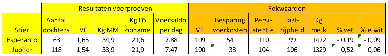 Resultaten van voeropnameproeven van CRV (2017/2021) bij de dochters van twee stieren omgerekend naar de fokwaarde VE. Toegevoegd zijn enkele andere fokwaarden om te laten zien dat de hogere VE vooral komt uit een hogere productie en lagere gehaltes.