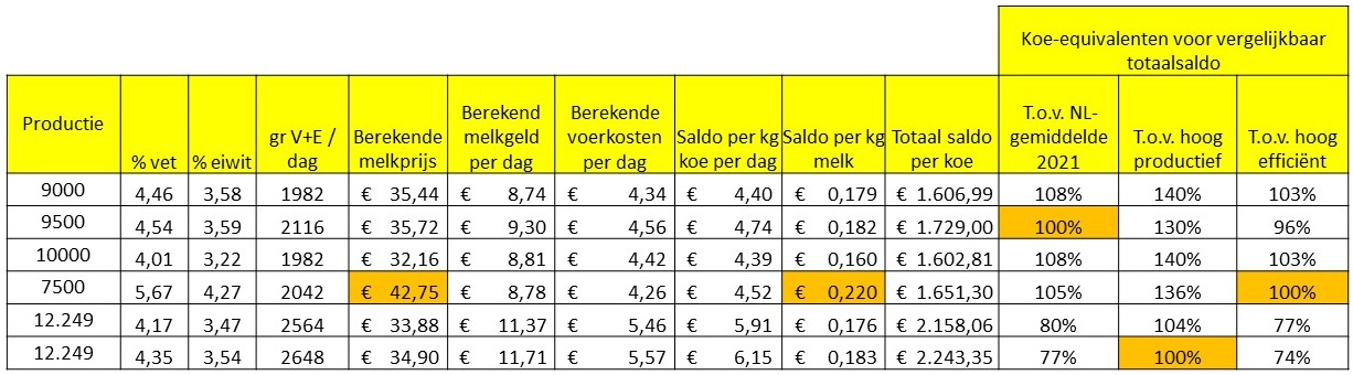 In de tabel zijn van koeien met verschillende producties en gehaltes de economische efficiënties berekend. Daarbij is aangegeven hoeveel koe-equivalenten (de referentie is een gemiddelde koe met de gemiddelde productie) meer of minder gehouden zouden moet worden om een vergelijkbaar saldo op bedrijfsniveau te realiseren, weergegeven in procenten ten opzichte van de referentie-koe (=100%). In regel 2 gaat het om de gemiddelde Nederlandse koe. Uitleg volgt hierna.