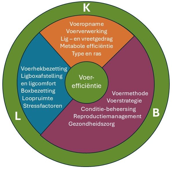Zoals de meeste aspecten rond productie, gezondheid en levensduur wordt ook de voerefficiëntie bepaald door de drie hoofdfactoren volgens het KBL-principe zoals we dat in § 2.3 hebben beschreven. In het navolgende gaan we in op een aantal aspecten in relatie tot de voerefficiëntie zoals de bedrijfsvoering, leefomgeving en de fokkerij. De meeste winst valt te behalen bij een optimale bedrijfsvoering. De fokkerij bespreken we als laatste gezien de vele onzekerheden over de genetica achter de voerefficiëntie. In het blok Aandachtspunten en tips geven we per hoofdfactor van de KBL-aanpak een aantal aandachtspunten en tips om de VE te kunnen verbeteren. Net als bij de andere aspecten gaat het altijd om de wisselwerking tussen de factoren. Het is nooit één punt van aandacht aangezien ze elkaar kunnen beïnvloeden. We geven dat zo goed mogelijk aan in de tekst.